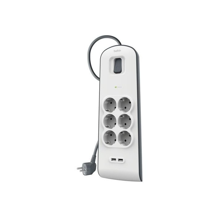 La regleta Belkin BSV604VF2M-V2 está diseñada para ofrecer una solución segura y eficiente en la conexión de dispositivos electrónicos en el hogar o la oficina. Con 6 tomas de corriente CA y 2 puertos USB-A, permite alimentar múltiples equipos al mismo tiempo, protegiéndolos frente a sobretensiones y picos de corriente. Su diseño moderno en gris y blanco, junto con su funcionalidad, la convierten en una opción práctica para usuarios que buscan comodidad, seguridad y organización.